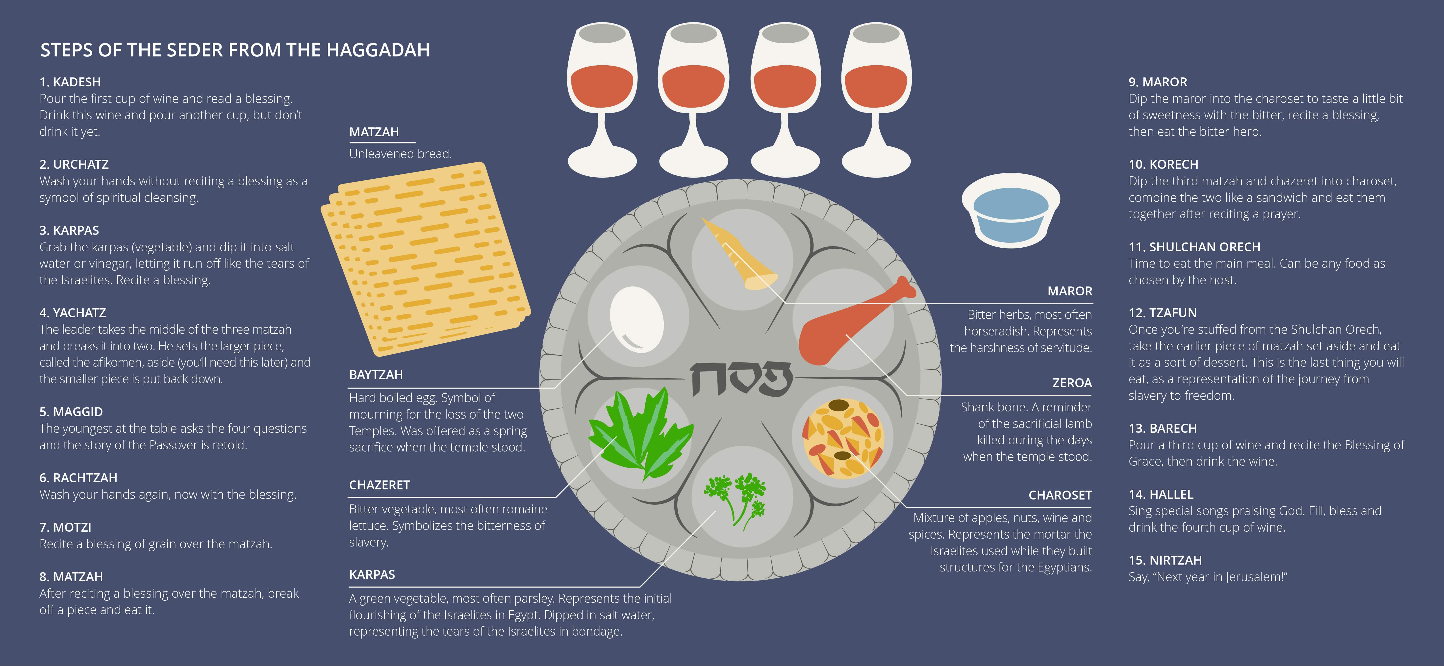 The seder encompasses 15 steps laid out plainly in the Haggadah, the text read during the ceremonial meal.